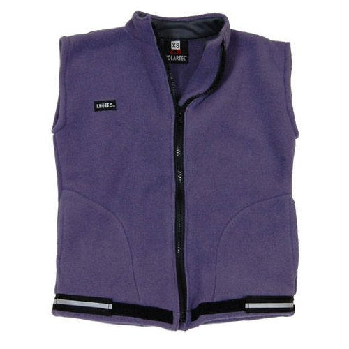 Recycled Fabric, Made in USA - This fleece vest is warm and versatile, with a few unique features that separate it from whatever you might find at your nearest outdoor store. First of all, note the reflective stripe around the bottom - so you can feel just a little safer when you are outside after dark. In the front, the reflective trim readjusts over velcro so you can cinch it up as much as you want to keep out snow or wind - yet keep the reflective trim intact and effective. Finally, this vest is more sustainable than most, as it is made here in the USA from toasty warm Polartec 300 recycled fleece, which is also made here in the USA. 100% Polartec 300 recycled fleece. Designer Brand: Knutes..../ Recycled Fleece Vest - Purple / Vest Women